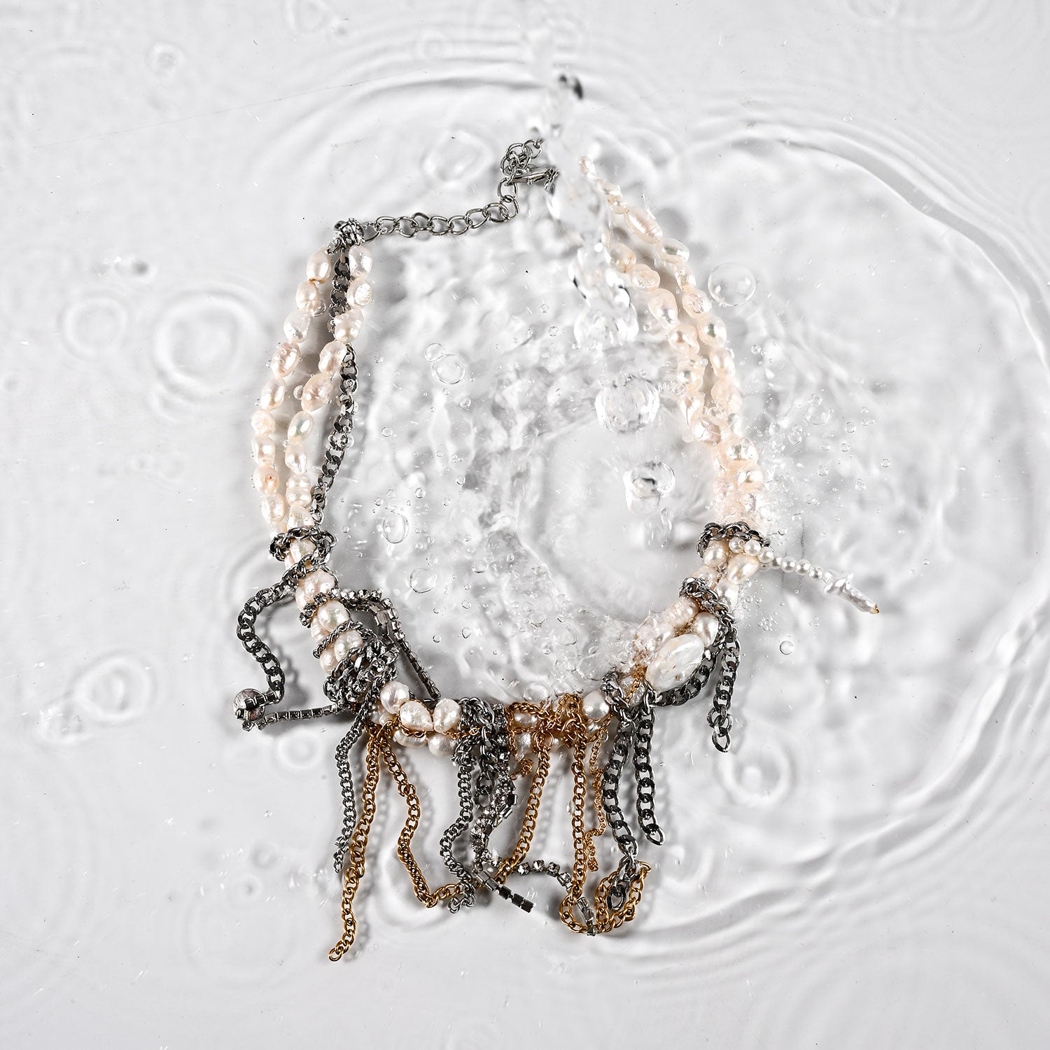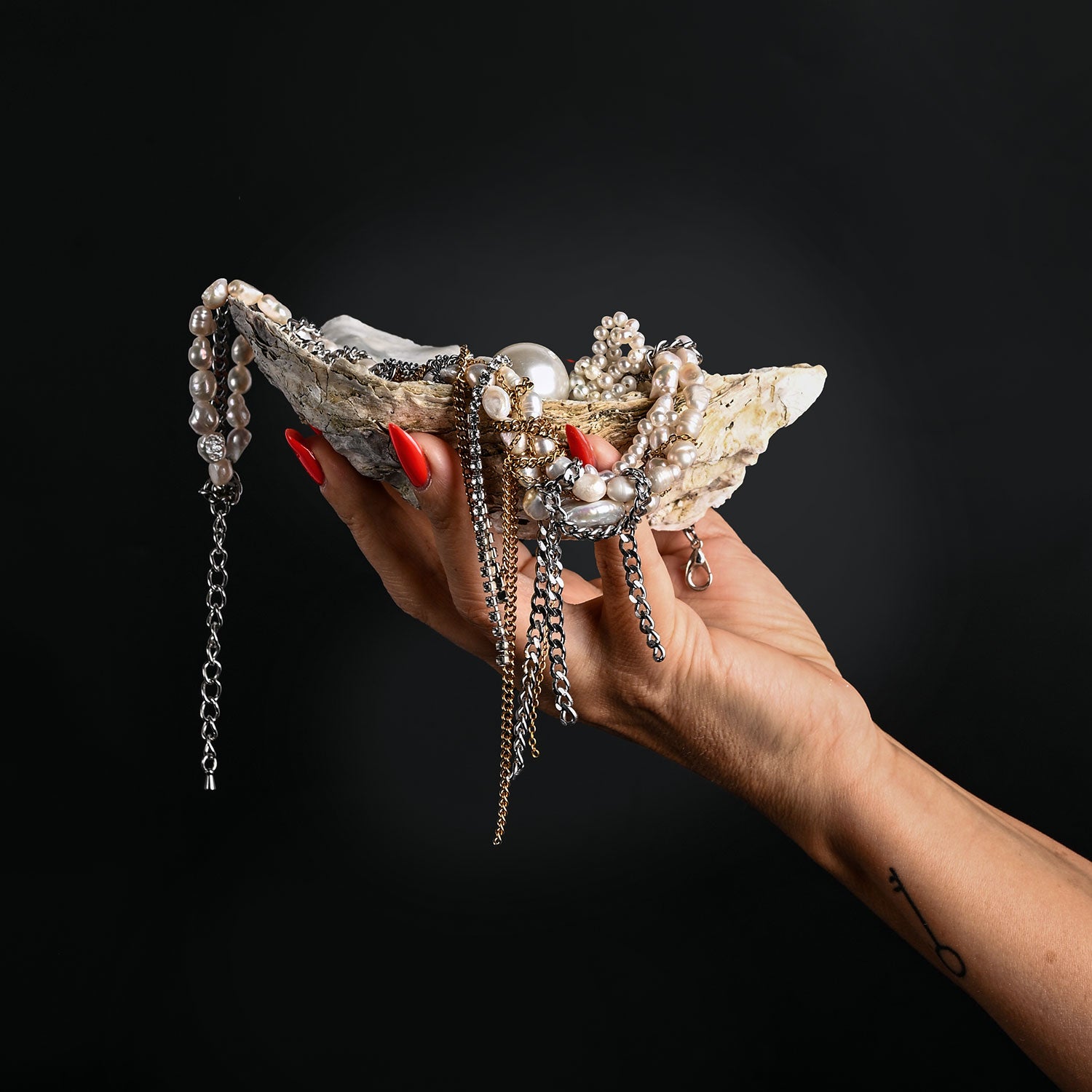 Unless your grandmother once started a fire and never apologized. Pearls paired with steel like a dare. The contrast is the point. The beauty is in the tension. You could wear this with silk. Or with a leather jacket you "borrowed" in 2013 and never gave back. Either way, it belongs.